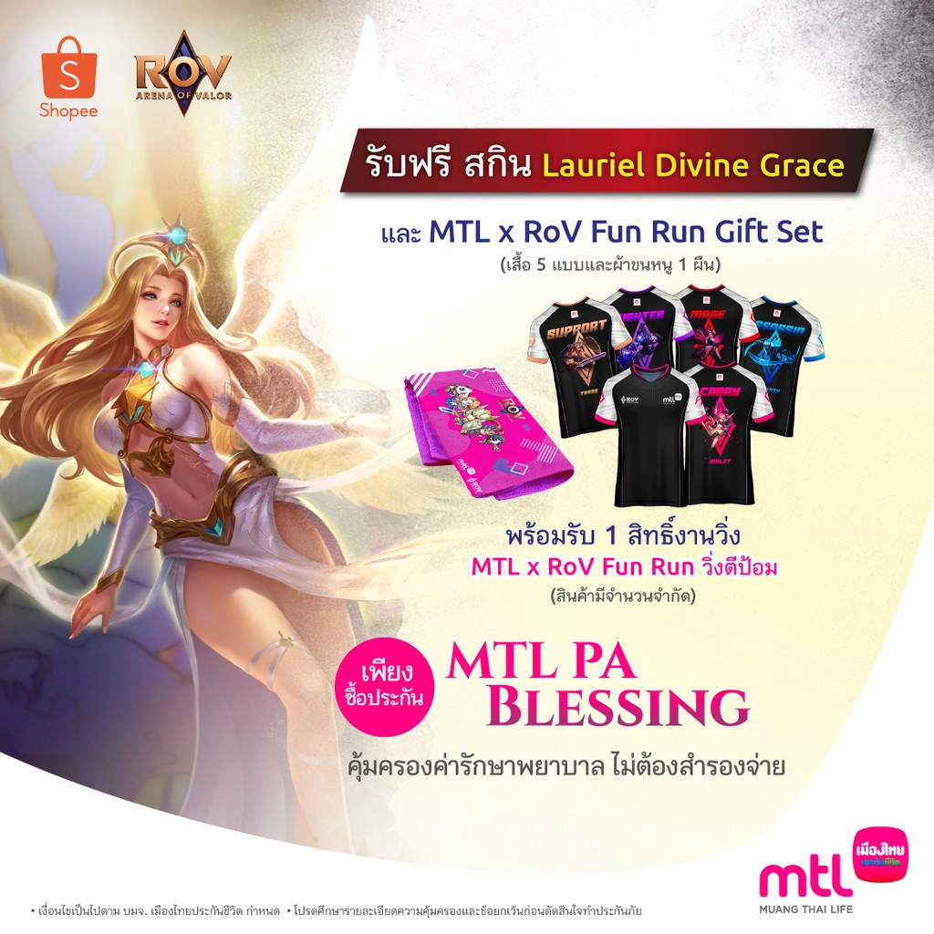 สำหรับลูกค้าที่ซื้อผลิตภัณฑ์ เมืองไทย Glorious Saving 11/3 หรือ เมืองไทย PA Blessing สมัครและชำระเบี้ยประกันภัยผ่าน Shopee ระหว่างวันที่ 13 พฤศจิกายน - 20 ธันวาคม 2562 พิเศษ 200 ท่านแรก รับไปเลย! • สกิน Lauriel Divine Grace • 1 สิทธิ์งานวิ่ง MTL x RoV Fun Run • เสื้อวิ่ง MTL x RoV Fun Run 5 ตัว 5 แบบ และผ้าขนหนู 1 ผืน - ระยะเวลากิจกรรม : 13 พฤศจิกายน - 20 ธันวาคม 2562 - บริษัทฯ จะแจ้งรายละเอียดการลงทะเบียนงานวิ่ง และรับของสมนาคุณให้กับผู้ที่ได้สิทธิ์ผ่านทาง SMS ตามเบอร์โทรที่ระบุในคำสั่งซื้อภายในวันที่ 20 ธันวาคม 2562 - ขอสงวนสิทธิ์ของสมนาคุณสำหรับผู้ซื้อที่ทำตามเงื่อนไขและครบถูกต้องเท่านั้น ในกรณียกเลิกคำสั่งซื้อหรือทำการอื่นเป็นเหตุให้การซื้อไม่สำเร็จ ถือเป็นการสละสิทธิ์ในการรับของสมนาคุณ - ของสมนาคุณไม่สามารถเปลี่ยนเป็นเงินสด หรือโอนไปบัญชีอื่นได้ในทุกกรณี - ขอสงวนสิทธิ์ในการเปลี่ยนแปลงเงื่อนไขและรายละเอียดกิจกรรมตามความเหมาะสม โดยไม่แจ้งให้ทราบล่วงหน้า - เงื่อนไขเป็นไปตามที่ Shopee, RoV, และบมจ. เมืองไทยประกันชีวิต กำหนด ---------------------------------------------------------------------------------------------------------------------------------------------- ขยันบอกต่อไม่ต้องรอไม่ต้องลุ้น แค่ลูกค้าเก่าบอกต่อเพื่อนๆ สมัครประกันชีวิตผ่าน Shopee รับเลย Shopee Voucher 50 บาท รีบบอกต่อกันเลยนะ วันนี้ - 31 ธ.ค. 62 เท่านั้น กติกาและเงื่อนไข - ผู้ซื้อใหม่ ต้องใส่ Username Shopee ของผู้แนะนำ ที่ช่องข้อความ ในขั้นตอนการสั่งซื้อสินค้า - ผู้ซื้อใหม่และผู้แนะนำจะได้รับ Shopee Gift Voucher code คนละ 50 บาท ทาง SMS ตามเบอร์โทรติดต่อที่ให้ไว้กับบริษัทฯ ภายใน 45 วัน หลังจากทำรายการสำเร็จ - ระยะเวลาร่วมกิจกรรม ตั้งแต่วันที่ 15 ตุลาคม – 31 ธันวาคม 2562 - ของรางวัลไม่สามารถเปลี่ยนเป็นเงินสดหรือรางวัลอื่นแทนได้ - เงื่อนไขเป็นไปตามที่ บมจ. เมืองไทยประกันชีวิต กำหนด - เงื่อนไขการใช้ Shopee Gift Voucher เป็นไปตามที่บริษัท ช้อปปี้ (ประเทศไทย) จำกัด กำหนด ---------------------------------------------------------------------------------------------------------------------------------------------- > หากมีข้อสงสัยโทร 1766 หรือกด “แชทเลย” > การชำระเงินผ่าน Shopee ถือเป็นการชำระเงินให้แก่บริษัทฯ โดยตรง > หลังชำระเงินคุณจะยังไม่ได้รับความคุ้มครองจนกว่าจะกรอกใบคำขอเอาประกันชีวิต และผ่านการพิจารณารับประกันภัยจากบริษัทฯ กรุณากรอกข้อมูลในใบคำขอตามลิงก์ที่ได้รับผ่าน sms ภายใน 7 วัน กรณีไม่ทำรายการภายในเวลาที่กำหนด บริษัทฯ ขอสงวนสิทธิ์ในการแจ้งยกเลิกคำสั่งซื้อไปยัง Shopee ในทันที โดยคุณจะได้รับเงินคืนผ่านบัตรเครดิตที่ใช้ชำระเงินตามกระบวนการของธนาคารเจ้าของบัตร หรือผ่าน Shopee Wallet ขึ้นอยู่กับช่องทางที่ใช้ชำระเงิน ตามนโยบายของ Shopee ---------------------------------------------------------------------------------------------------------------------------------------------- 
