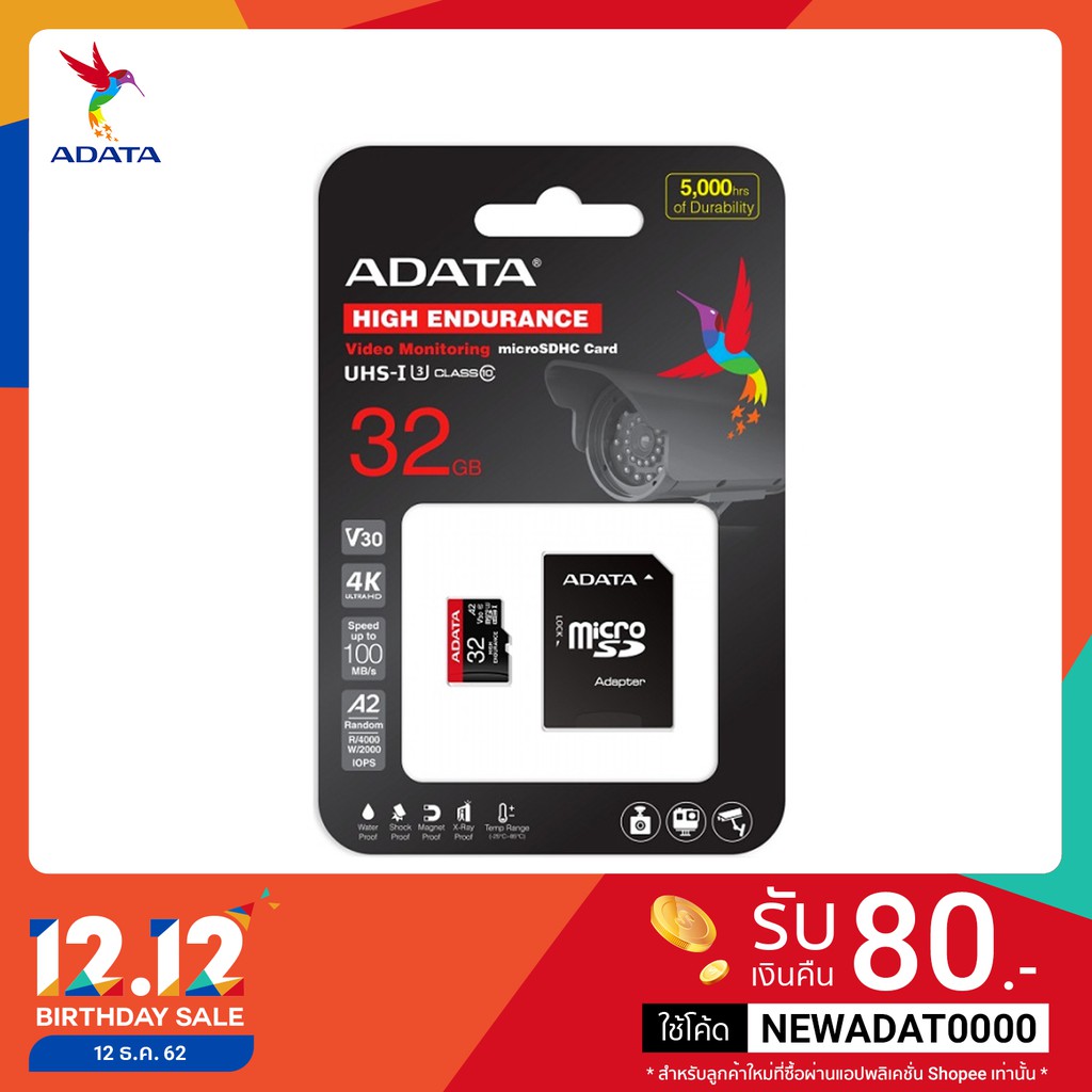 High Endurance microSDXC/SDHC UHS-I Card (Micro SD สำหรับกล้องวงจรปิด) ADATA การ์ดความทนทานสูง microSDXC / SDHC UHS-I เป็นการ์ดหน่วยความจำ ความทนทานสูง Video Speed Class 30 (V30) ที่ออกแบบมาโดยเฉพาะสำหรับการบันทึกต่อเนื่องและบันทึกซ้ำอย่างต่อเนื่อง เหมาะอย่างยิ่งสำหรับ dashcams ระบบป้องกัน และแอพพลิเคชั่นอื่นๆ ที่ต้องการความยาวนานในการบันทึกที่ไม่หยุดยั้ง ยิ่งไปกว่านั้นด้วยประสิทธิภาพแอปพลิเคชันคลาส 2 (A2) สามารถมอบประสบการณ์การใช้ที่รวดเร็ว และราบรื่นขึ้นให้กับผู้ใช้ นอกจากนี้ยังสามารถทนทานสภาพแวดล้อมที่เป็นอุปสรรค กันน้ำ กันกระแทก และกันรังสีเอกซ์ คุณสมบัติ • ความจุ: 32GB • มาตรฐาน: SD 6.0 • ขนาด (ยาว x กว้าง x สูง): 15 x 11 x 1 มม • น้ำหนัก: 0.25 กรัม • รองรับการบันทึกและเล่น Full HD 1080p และ Ultra HD 4K • การใช้งาน: 2.7V - 3.6V • อุณหภูมิในการทำงาน: -25 ° C - 85 ° c • ประสิทธิภาพ R / W: สูงถึง 100MB / 80MB ต่อวินาที * ความเร็วในการอ่าน / เขียนตามการทดสอบภายใน ADATA ประสิทธิภาพที่แท้จริงอาจแตกต่างกัน • Speed Class: UHS Speed: Class 3 • ระดับความเร็ว: Class 10 • คลาสความเร็ววิดีโอ: V30 • แอพลิเคชันระดับประสิทธิภาพ: A2 • สามารถใช้ได้กับ: สมาร์ทโฟน / แท็บเล็ต / กล้องติดรถยนต์ / กล้องเคลื่อนไหว / กล้องวงจรปิด • รับรอง: CE, FCC, RCM, EAC, VCCI • รับประกัน: 2 ปี โดยประกันศูนย์ SIS ประเทศไทย High Endurance microSDXC/SDHC UHS-I Card ADATA High Endurance microSDXC/SDHC UHS-I cards are high endurance, Video Speed Class 30 (V30) memory cards that are specifically designed for continuous recording and constant re-recording. They are ideal for dashcams and surveillance systems, and any other application that requires stamina for non-stop recording. What's more, with an Application Performance Class 2 (A2) rating, they can provide users with a faster, smoother app experience. Plus, they can handle extreme environments with their waterproof, shockproof, and X-ray-resistant constructions. Features • Capacity : 32GB • Standard : SD 6.0 • Dimensions (L x W x H) : 15 x 11 x 1mm • Weight : 0.25g • Full HD 1080p และ Ultra HD 4K • Working Voltage : 2.7V - 3.6V • Operating Temperature : -25°C - 85°C • R/W performance : up to 100MB / 80MB per sec * Read / Write speed based on ADATA internal testing , actual performance may vary • Speed Class : UHS Speed : Class 3 • Speed Class : Class 10 • Video Speed Class : V30 • Application Performance Class : A2 • Compatibility : Smartphone / Tablet / Dash Recorder / Motion Camera / Surveillance camera • Certifications : CE, FCC, RCM, EAC, VCCI • Warranty : 2-year limited