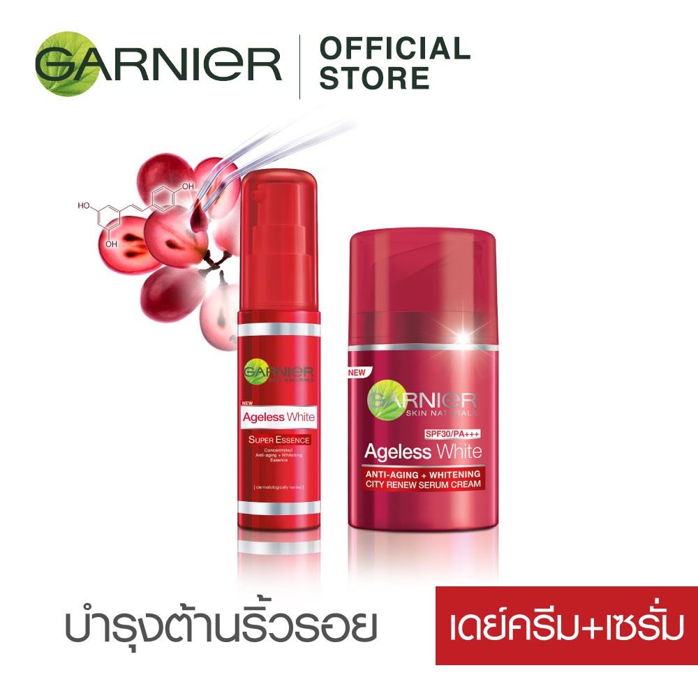 1.) การ์นิเย่ สกิน แนทเชอรัลส์ เอจเลส ไวท์ แอนตี้-เอจจิ้ง + ไวท์เทนนิ่ง ซิตี้ รีนิว เซรั่ม ครีม 50 มล. GARNIER SKIN NATURALS AGELESS WHITE ANTI-AGING + WHITENING CITY RENEW SERUM 50 ml เมื่ออายุเพิ่มขึ้น ผิวสูญเสียคอลลาเจนตามธรรมชาติ ขาดความกระชับและประกายแห่งความอ่อนเยาว์ อีกทั้งการใช้ชีวิตในเมืองยิ่งทำให้ผิวดูแก่กว่าวัยและหมองคล้ำเร็วขึ้น เพราะต้องเผชิญรังสียูวี มลภาวะที่มองไม่เห็น ความเครียดและการพักผ่อนที่ไม่เพียงพอ ผิวหย่อนคล้อย ริ้วรอยแห่งวัย ฝ้า กระ และความหมองคล้ำจึงเกิดปัญหาใหญ่ของผู้หญิงในปัจจุบัน การ์นิเย่จึงสร้างสรรค์สูตรเฉพาะเพื่อฟื้นบำรุงผิวดูแก่ก่อนวัย และหมองคล้ำจากการใช้ชีวิตในเมือง ด้วยส่วนผสมสารสกัดจากเมล็ดองุ่น เหตุผลที่ทำให้คุณหลงรัก ริ้วรอยเหี่ยวย่น ตีนกา และจุดด่างดำจางลง ฟื้นบำรุงความยืดหยุ่นของผิว ผิวดูกระชับ เต่งตึงขึ้นอย่างเห็นได้ชัด วิธีใช้ ทาทั่วใบหน้าและลำคอที่สะอาด หลีกเลี่ยงบริเวณผิวรอบดวงตา เพื่อผลลัพธ์ที่ดีที่สุด แนะนำใช้ร่วมผลิตภัณฑ์ในกลุ่มการ์นิเย่ เอจเลสไวท์ ไม่ว่าจะเป็นการ์นิเย่ สกิน เนเชอรัล เอจเลส ไวท์ แอนตี้-เอจจิ้ง + ไวท์เทนนิ่ง มิราเคิล ครีม ที่ผสมสารกันแดด SPF/PA++ เนื้อครีมที่เข้าได้กับทุกสีผิว หรือการ์นิเย่ สกิน เนเชอรัล เอจเลส ไวท์ แอนตี้-เอจจิ้ง + ไวท์เทนนิ่ง ไนท์ ครีมบำรุงสำหรับกลางคืนล๊อคอายุผิวให้คงความอ่อนเยาว์อยู่เสมอ 2.) การ์นิเย่ เอจเลส ไวท์ ซุปเปอร์เอสเซ้นส์ 30 มล. Garnier Ageless White Super Essence 30 ml. เอสเซ้นต์บำรุงผิวหน้า ช่วยลดเลือนริ้วรอย พร้อมเผยผิวกระจ่างใส เมื่ออายุเพิ่มขึ้นผิวสูญเสียคอลลาเจนตามธรรมชาติ เกิดริ้วรอย กระและฝ้าแดด ผิวหย่อนคล้อยขาดความกระชับและประกายแห่งความอ่อนเยาว์ อีกทั้งการใช้ชีวิตในเมืองยิ่งอาจทำให้ผิวดูแก่กว่าวัยและคลองคล้ำเร็วขึ้นเพราะต้องเผชิญทั้งรังสียูวี มลภาวะที่มองไม่เห็น ความเครียด และการพักผ่อนไม่เพียงพอ การใช้ครีมอย่างเดียวอาจยังไม่เพียงพออีกต่อไป ค้นพบเทคโนโลยีล่าสุดจากการ์นิเย่ เอจเลส ไวท์ ซุปเปอร์ เอสเซ้นต์ ลดเลือนริ้วรอยเข้มข้นที่สุด+ เนื้อสัมผัสบางเบา ซึมซาบเร็วลึกถึงชั้นผิว* อุดมด้วยพลังเข้มข้นที่สุดของโปร-คอลลาเจน พร้อมวิตามินซีเข้มข้นขึ้น 20 เท่า** และผสานคุณค่าจากสารสกัดเมล็ดองุ่น ตรงเข้าฟื้นบำรุงปัญหาริ้วรอยและความหมองคล้ำจากการใช้ชีวิตในเมือง พบผลลัพธ์ของผิวอ่อนเบาว์ที่เหนือกว่า- ทันทีที่ใช้ รู้สึกถึงผิวที่เรียบเนียนนุ่มขึ้น หลังใช้เพียง 1 สัปดาห์ ผิวอิ่มเด้ง กระจ่างใสขึ้น เมื่อใช้เป็นประจำอย่างต่อเนื่อง 4 สัปดาห์ • ริ้วรอยเหี่ยวย่นบนหน้า