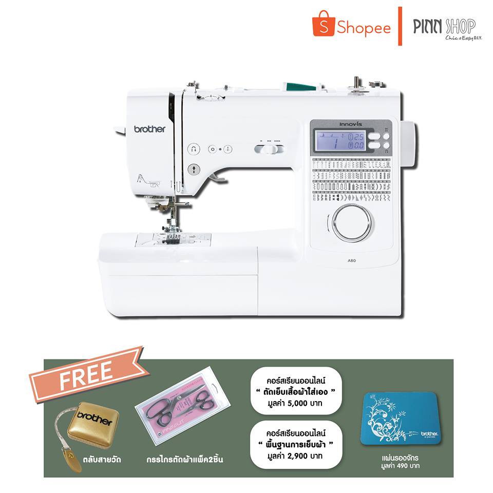 คุณสามารถซื้อ Brother จักรเย็บผ้าระบบคอมพิวเตอร์ รุ่น A80 พร้อมกรรไกรตัดผ้าแพ็ค2ชิ้น และตลับสายวัด แถมแผ่นรองจักร+ >>ออนไลน์ได้ที่นี่<<