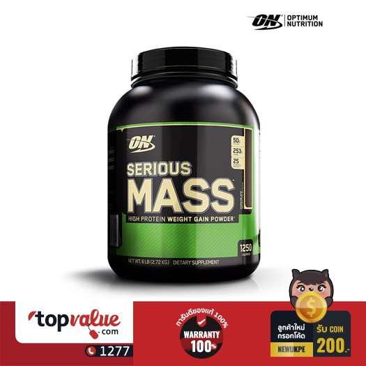 ▶▶โปรดอ่านก่อนสั่งซื้อ◀◀ ✔️สินค้าทุกชิ้นของทางร้าน Topvalue เป็นสินค้าใหม่ ของแท้ 100% สามารถออกใบกำกับภาษีเต็มรูปแบบได้ ✔️บริษัทฯ ยินดีรับเปลี่ยน / คืนสินค้า ภายใน 7 วัน ♻️ สาเหตุและข้อตกลงของการขอเปลี่ยนหรือคืนสินค้า ♻️ 1.สินค้าใช้งานแล้วมีปัญหาภายใน 7 วัน : บริษัทจะเปลี่ยนสินค้าใหม่ให้ลูกค้า 2.เปลี่ยนใจ : ไม่สามารถขอคืนสินค้าได้ แต่สามารถเปลี่ยนสีหรือรุ่นที่ราคาเท่าเดิม 3.ได้รับสินค้าผิด : สินค้ายังไม่ถูกใช้งาน และต้องอยู่ในสภาพสมบูรณ์ 4.สินค้าไม่ตรงตามที่โฆษณาไว้ : สินค้าไม่สามารถใช้งานได้ตามที่บรรยายไว้ สินค้ายังไม่ถูกใช้งาน และต้องอยู่ในสภาพสมบูรณ์ 5.สินค้าชำรุด/เสียหาย : ส่งสินค้ากลับมาให้ทางบริษัทตรวจสอบ กล่องและอุปกรณ์ต้องครบ - หากพบว่า มีปัญหาจริง บริษัทจะเปลี่ยน/คืนเงินให้ - หากพบว่า ไม่ได้มีปัญหาจริง บริษัทจะจัดส่งสินค้าเดิมให้ ✔️ทางบริษัทฯ จะรับผิดชอบค่าขนส่ง จากข้อผิดพลาดของทางบริษัทฯ เขตกรุงเทพฯ ไม่เกิน 150 บาท และ ต่างจังหวัด ไม่เกิน 300 บาท ☎️ สอบถามรายละเอียดสินค้าได้ทาง Chat หรือติดต่อ Topvalue Call center 1277 ✄============================== แนะนำสินค้า Optimum Nutrition Serious Mass Weight Gainer 6lbs - Chocolate Weight Gainer สูตรออกแบบสำหรับคนผอมโดยเฉพาะ สำหรับคนที่ต้องการเพิ่มกล้ามเนื้อ และน้ำหนักตัวอย่างรวดเร็ว ให้โปรตีนคุณภาพสูงจากหลายแหล่ง Whey Protein, Casein และ Egg Albumin เพื่อช่วยในการดูดซึมโปรตีนเข้าสู่เซลล์กล้ามเนื้อแต่ละช่วงเวลา แคลลอรี่สูง อุดมด้วยสารอาหารครบถ้วน เช่น Vitamin&Mineral, Branch Chain Amino Acids, Creatine, L-Glutamine, Glutamine Peptides และอื่นๆ อีกมากมาย คุณสมบัติ ให้พลังงานกว่า 1,250 แคลอรี่ อุดมไปด้วยโปรตีนคุณภาพสูงถึง 50 กรัม กว่า 250 กรัม กับคาร์โบไฮเดรตที่ปราศจากน้ำตาล มีส่วนผสมของ CREATINE และ GLUTAMINE วิตามิน และเกลือแร่รวม สูงถึง 25 ชนิด วิธีรับประทาน วันที่ออกกำลังกาย : หลังตื่นนอนทันที ชง Serious Mass 1 ช้อนตวง ผสมกับน้ำเย็น หรือถ้าต้องการโปรตีนเพิ่มมากขึ้น สามารถทานกับนมจืดได้ (สัดส่วนปริมาณน้ำ หรือนมจืด ขึ้นอยู่กับความชอบส่วนบุคคล : ปริมาณแนะนำ 10-12 ออนซ์) ก่อนออกกำลังกาย ประมาณ 30 นาที ชง Serious Mass 1 ช้อนตวง ผสมกับน้ำเย็น หลังออกกำลังกายทันที ชง Serious Mass 1 ช้อนตวง ผสมกับน้ำเย็น วันที่ไม่ออกกำลังกาย : หลังตื่นนอนทันที ชง Serious Mass 1 ช้อนตวง ผสมกับน้ำเย็น หรือถ้าต้องการโปรตีนเพิ่มมากขึ้น สามารถทานกับนมจืดได้ (สัดส่วนปริมาณน้ำ หรือนมจืด ขึ้นอยู่กับความชอบส่วนบุคคล : ปริมาณแนะนำ 10-12 ออนซ์) ช่วงบ่าย(ท้องว่าง) ชง Serious Mass 1 ช้อนตวง ผสมกับน้ำเย็น หรือถ้าต้องการโปรตีนเพิ่มมากขึ้น สามารถทานกับนมจืดได้ (สัดส่วนปริมาณน้ำ หรือนมจืด ขึ้นอยู่กับความชอบส่วนบุคคล : ปริมาณแ