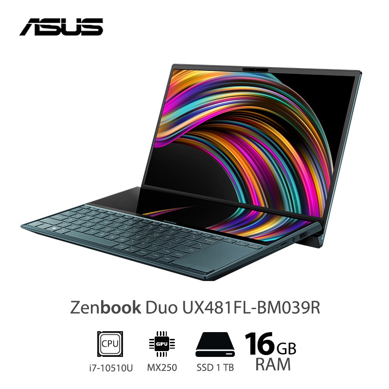[ผ่อน 0% 10 เดือน] Asus Zenbook Duo UX481FL-BM039R #ASUS #ZenbookDuo #Intelcorei7 #SSD1TB #Win10Pro สี Celestial Blue รับประกันสินค้า 2 ปีเต็ม ===================================== - Dimension : 199 x 323 x 223 มิลลิเมตร - Weight : 1.5 กิโลกรัม (รวมแบตเตอรี่) - Display : ขนาด 14 นิ้ว หน้าจอ LED-backlit Full HD (1920 x 1080) 16:9 slim-bezel NanoEdge display 3.5mm-thin bezel with 90% screen-to-body ratio178° wide-view technology 100% sRGB - ScreenPad Plus : 12.6” touch display 178˚ wide-view technology - CPU : Intel® Core™ i7-10510U processor, 1.8 GHz (8M Cache, up to 4.9 GHz) - GPU : NVIDIA® GeForce® MX250 , with 2GB GDDR5 VRAM - RAM : 16GB 2133MHz LPDDR3 - Storage : 1TB PCIE G3X4 SSD - Keyboard : Full-size backlit with 1.4mm key travel - Networking : Intel Wi-Fi 6 with Gig+ performance (802.11ax) , Bluetooth Bluetooth® 5.0 - Interface : 1 x USB 3.1 Gen 2 Type-C™ (up to 10Gbps) 1 x USB 3.1 Gen 2 Type-A (up to 10Gbps) 1 x USB 3.1 Gen 1 Type-A (up to 5Gbps) 1 x HDMI 1 x Audio combo jack 1 x MicroSD card reader 1 x DC-in - Battery : 70Wh 4-cell lithium-polymer battery - OS : Windows 10 Pro - Power Adapter : 65W power adapter Plug Type: ø4.5 (mm) (Output: 19V DC, 3.42A, 65W) (Input: 100-240V AC, 50/60Hz universal) FREE : SLEEVE , STYLUS , STAND