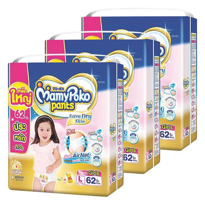 สั่งซื้อ [ถูกยกลัง]มามี่โพโค Mamy Poko Diaper Pants กางเกงผ้าอ้อม Extra Dry Skin (เด็กหญิง)ไซส์ L62 ชิ้น 3 แ