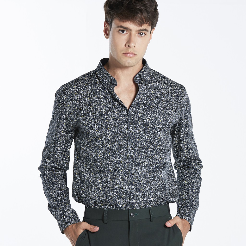 สั่งซื้อ Morgan Homme เสื้อเชิ๊ตแขนยาวสีกรมเขียว ทรงเข้ารูป พิมพ์ลายดอกไม้เล็กๆ รุ่น Muzu